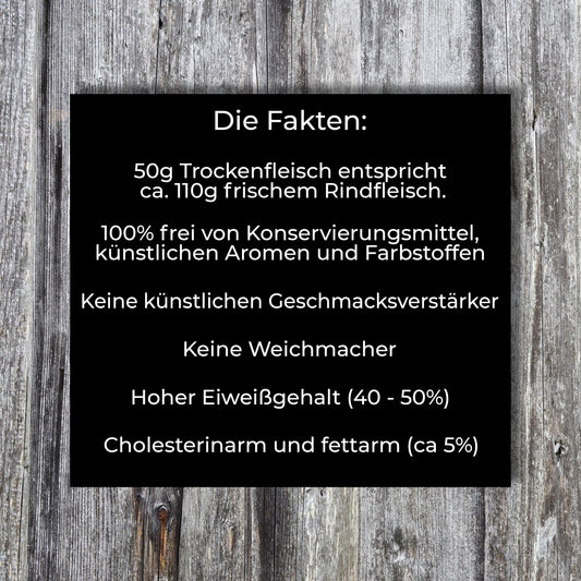 Naše Beef Jerky sice není dietní jídlo, ale je to potravina s vysokým obsahem bílkovin, která tě nadchne extrémně dobrou chutí. Obsah bílkovin je opravdu impozantní: V 100 gramech Beef Jerky je přibližně 50 gramů bílkovin můžeš si tuto chutnou sušenou maso v podstatě užívat kdykoliv a kdekoliv, doma i v práci, na cestách v autě a při volnočasových aktivitách. Vyrobeno z nejlepšího hovězího masa a bez zbytečných přísad, má intenzivní a chutný charakter Biltong.